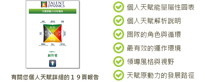 「天賦原動力」測驗系統是提高信任度和流量的全球領先的分析工具。從天賦測驗中找出八種屬性中的哪一種才是您與生俱來順流的道路。天賦原動力的測驗報告書將為您提供明確的方向,指示您在工作、業務、事業、家庭、關係、或職業上應遵循的道路,當您可以遵循你自己最自在的本能時,那你為什麼還這麼要努力工作呢?並不是說努力不好,而如何透過天賦測驗報告中內容運用在生活當中,降低人生阻力使你的目標夢想成就順流達成。